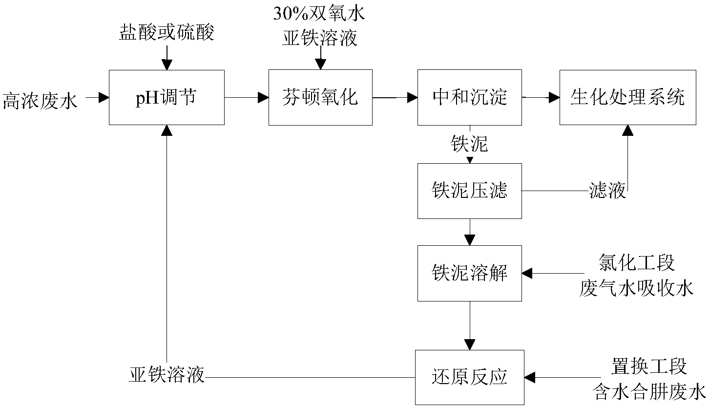 高濃度廢水經過污水池,加入酸性原料進行中和調解,中和后的污水加入雙氧水和亞鐵溶液,達到去除有害物質的目的。經過處理后的污水在經過中和沉淀,沉淀的淤泥經過特殊處理后外運。具體的工藝圖如下: